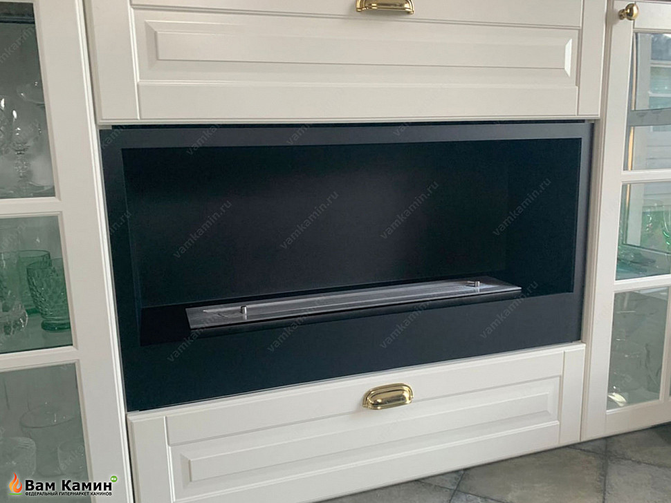 Еще один пример того, как можно элегантно встроить биокамин в мебель. В данном случае по фото видно, что биокамин SteelHeat поместили в тумбу шкафа для посуды. При этом экокамин изготавливался на заказ по желаемым размерам покупателя и с индивидуальным дизайном рамки очага. В итоге черный биокамин в интерьере выглядит акцентировано на фоне белого тона окраски шкафа для посуды.